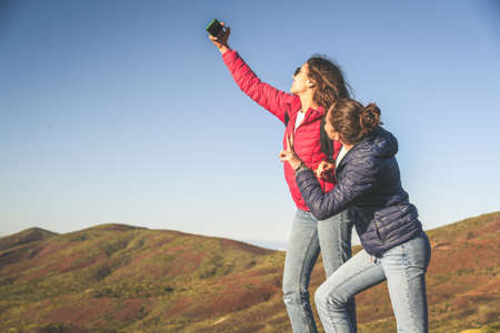young teen diverse girls taing selfies in the nature. High quality photo