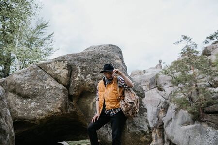 A man in an orange jacket and hat stands on a rock and looks into the distance. Mountain travel concept