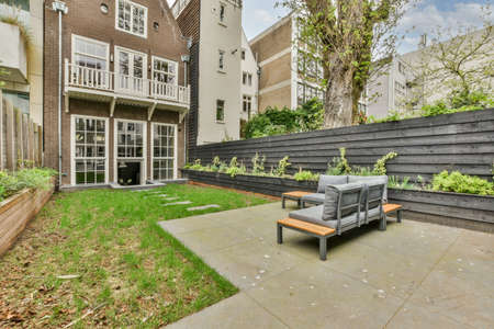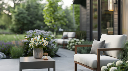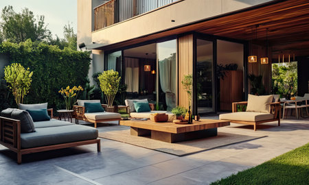 Modern House Exterior Garden Design Backyard Patio with Seating and Lush Greenery