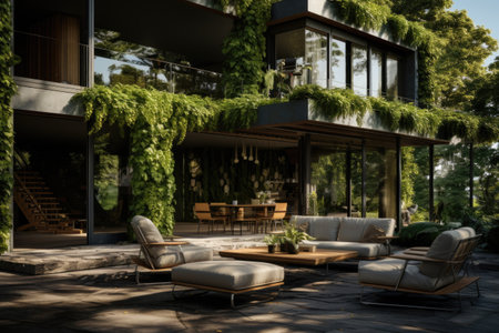 A blend of nature and design unfolds with a living green wall that spans the height of the house front, adding a touch of eco-friendly luxury. Generative AI