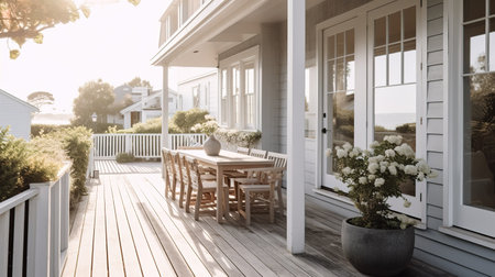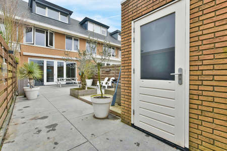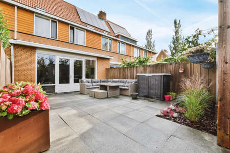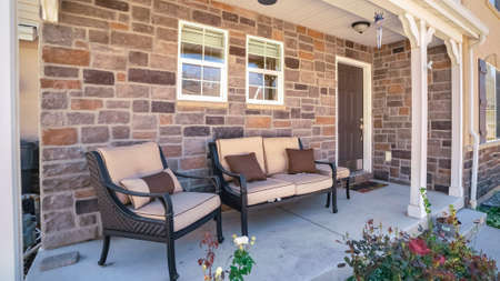 Panorama frame Outdoor furniture on a patio or porch of a double storey brick home overlooking the garden