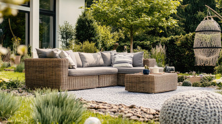 outdoor lounge area, with plush cushions and throw pillows, surrounded by greenery, created with generative ai