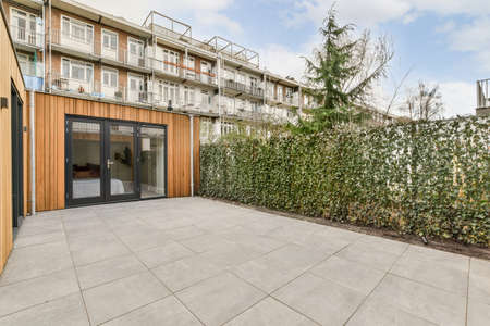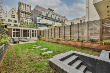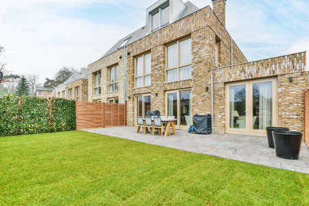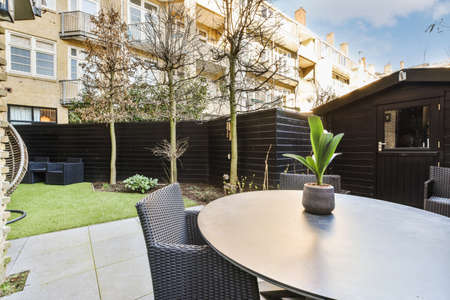 Minimalistic bright and landscaped backyard with dining area for outdoor recreation