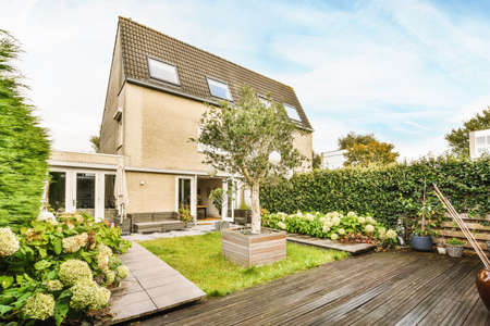 New construction home exterior boasts luxury oversized deck overlooking a Well-designed garden.