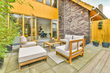 Wooden garden furniture on terrace with a floor constructed of wood boards