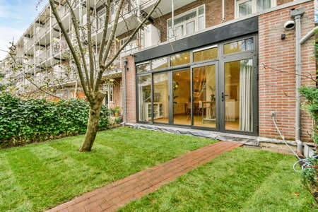 The courtyard of the house with a fresh lawn and a tree in the middle of the yard