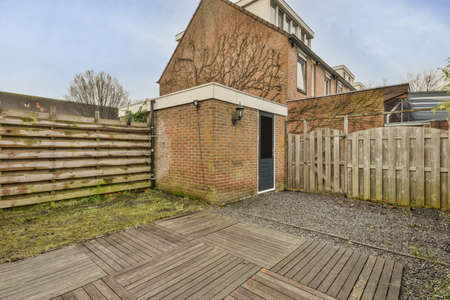 A backyard with a lawn, a small warehouse and a tiled floor at a cozy house
