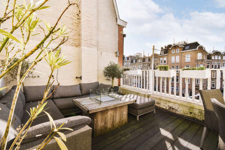 Luxury balcony with green cushions and wooden coffee table in the garden
