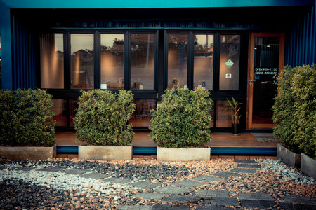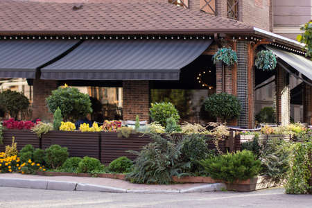 Beautiful view from the street to the cafe in the greenery of trees and flowers. Street cafe under a canopy in the morning
