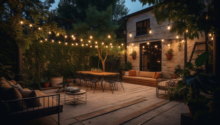 cozy outdoor patio with hanging lanterns, bistro chairs, and potted plants, created with generative ai
