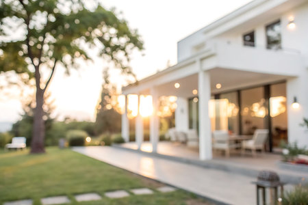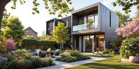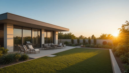 This image captures a serene modern home during sunset, showcasing a well-designed exterior and lush garden, creating a perfect atmosphere for relaxation.