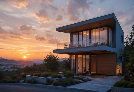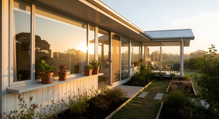 The exterior of a modern home features large glass windows reflecting the warm light of the setting sun. A landscaped garden with potted plants and neat pathways surrounds the contemporary building.