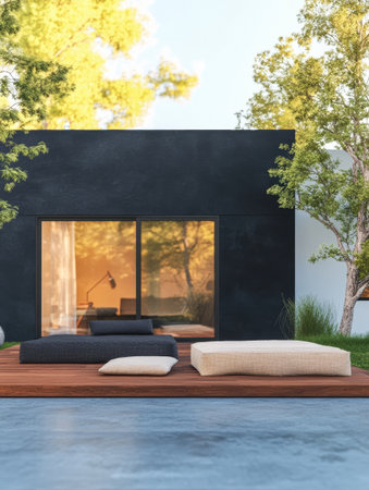 A stylish outdoor space features plush cushions arranged on a wooden deck in front of a contemporary black structure. Warm afternoon sunlight enhances the peaceful atmosphere surrounded by greenery.