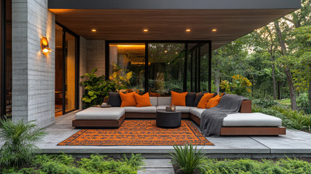 Comfortable orange couch on a modern terrace overlooking a forest with hanging lights