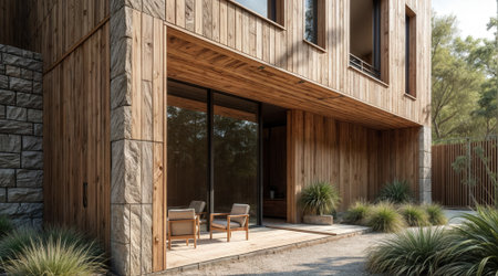 A contemporary wooden house featuring a spacious porch with two chairs, surrounded by lush greenery and stone walls, creating a tranquil atmosphere.