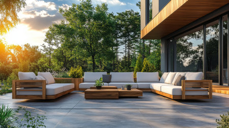 An outdoor living space featuring a seating arrangement comprised of sofas and armchairs, complemented by a low table and surrounding lush green trees. The composition presents a relaxed atmosphere with sunlight illuminating the scene. This image can be used for various projects, including home decor, landscape design, and lifestyle concepts.