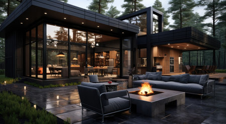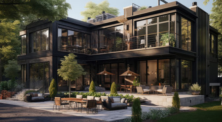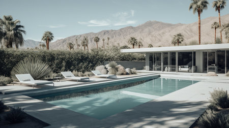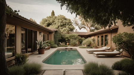 Home architecture design in Mid-century modern Style with Courtyard constructed by Wood and Glass material. Mid-century modern architecture style. Generative AI AIG25 .