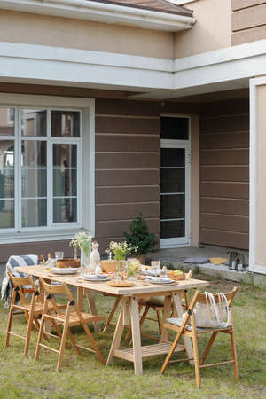 Several wooden chairs surrounding served table with homemade food, drinks and other stuff prepared for guests by country house