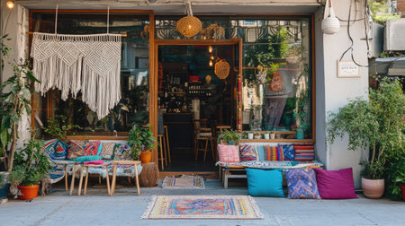 A bohemian-style cafe with macrame decor and outdoor cushions lining the sidewalk entrance