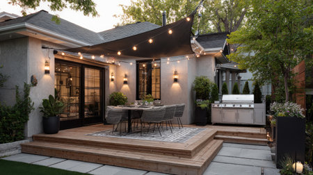 This image captures a beautifully arranged outdoor dining space featuring cozy seating, ambient lighting, and a grill station, perfect for gatherings.
