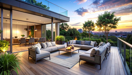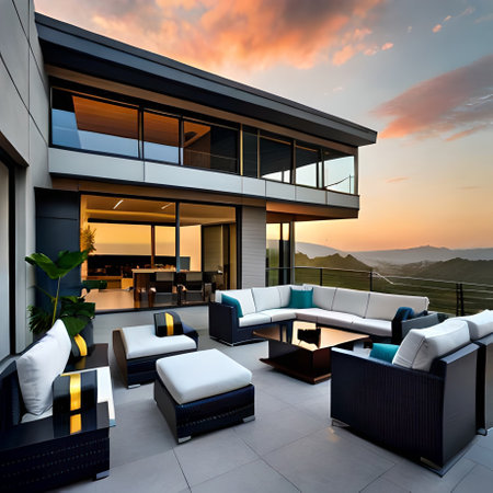 Experience a tranquil outdoor lounge with modern furniture set against a stunning sunset landscape, perfect for relaxation and leisure in a beautiful natural setting.