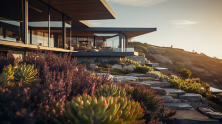 art deco architecture photography of sleek hillside house design by olson kundig. close-up shot of a blurred succulent in the foreground adds depth to the composition. shot in 8k from a cinematic perspective, with professional color grading and epic volumetric lighting. the sharp focus, film grain, and atmospheric ambiance enhance the overall aesthetic. captured using a sony alpha a7 iii camera with a sony fe
