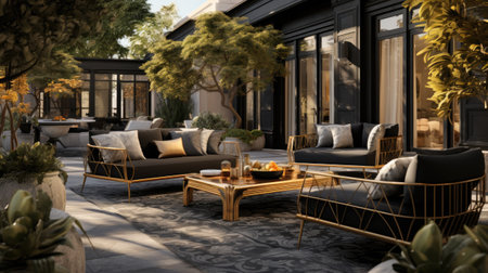 Delightful courtyard of the house with a soft sofa and a wicker table