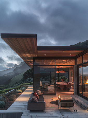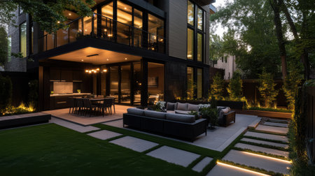 As twilight descends, a newly constructed residence reveals its inviting outdoor area. Fresh landscaping and elegant seating invite relaxation amidst warm lighting that enhances the ambiance.