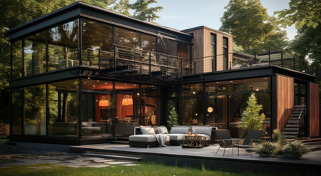 A stunning modern wooden house featuring extensive glass windows, situated in a lush forest, offering a peaceful retreat in nature's embrace.