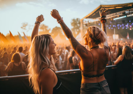Audience enjoying live performance at outdoor music festival during golden hour