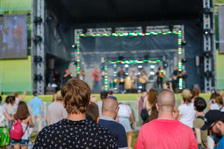 Audience watching concert at open air music festival, rear view, stage and spectators at background