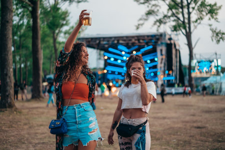 Two beautiful friends drinking beer and having fun on a music festival
