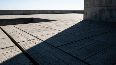 A minimalist concrete platform with sharp geometric shadows cast by sunlight against a clear sky.