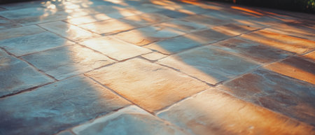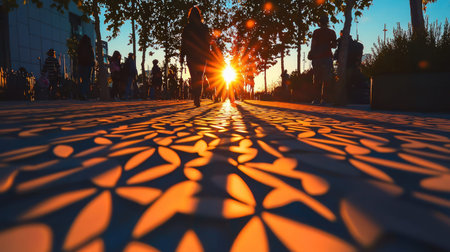 A captivating sunset casts long shadows on a patterned pavement, creating a beautiful display of light and shadow.