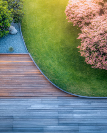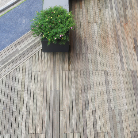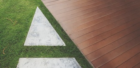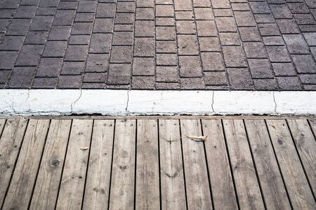 Garden Architecture Materials. Wooden Deck and Concrete Bricks Pavement in a Garden Top View.