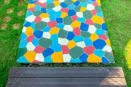 The walkway in the garden are paved with brightly colored stones and have just been cleaned by washing with water.