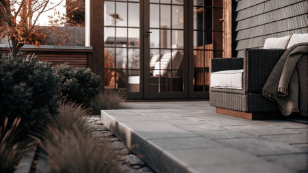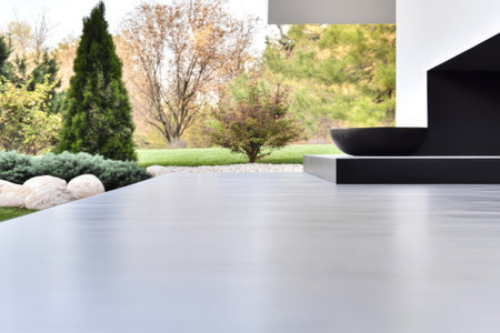 A modern patio area features sleek flooring and a black bowl centerpiece. Lush greenery surrounds the space showcasing a tranquil garden in autumn. Natural light enhances the serene atmosphere.