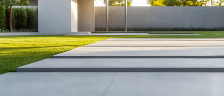 A sleek outdoor area showcases minimalist concrete pathways leading through beautifully manicured grass. Soft sunlight enhances the contemporary design creating a serene atmosphere.