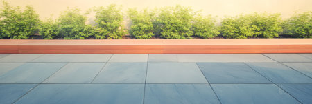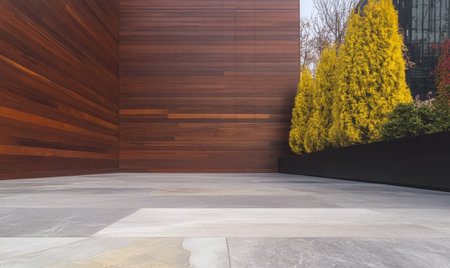 A stylish outdoor area features warm wooden walls sleek stone flooring and bright yellow shrubs. This serene space blends nature with urban architecture perfect for relaxation.