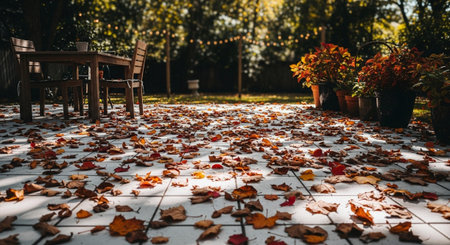 A sun-drenched autumn patio is covered in a vibrant carpet of fallen leaves in shades of red, orange, and brown. A rustic wooden table and chairs sit on the tiled floor, inviting relaxation. Overhead, a string of fairy lights casts a warm, bokeh glow, enhancing the cozy atmosphere. Dappled sunlight and shadows play across the scene, highlighting the rich colors of the season and the surrounding potted plants with their autumnal foliage.