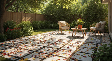 A charming outdoor patio area is depicted, paved with large square concrete tiles. The ground is scattered with colorful fallen leaves in shades of red, orange, and yellow, indicating an autumn setting. Two wicker chairs and a small wooden table with a potted plant are arranged on the patio, along with an outdoor rug. Lush green bushes and trees surround the area, with a wooden fence in the background. String lights are visible overhead, suggesting an inviting evening ambiance.