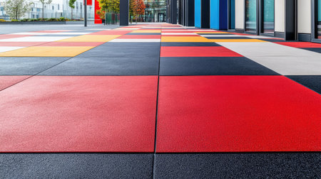 This image showcases a vibrant outdoor floor made of colorful paving tiles arranged in a geometric pattern, highlighting modern urban design and architecture.
