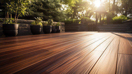 Empty wooden floor or decking with abstract blurred of garden background. For Display or product photo montage