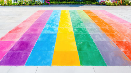 A stunning pavement design featuring vibrant stripes in various colors including yellow, green, and blue, creating a lively and modern outdoor atmosphere.