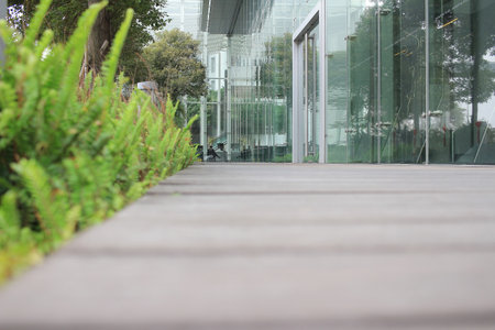 Art exterior design of floor with green grass, white tile and wooden