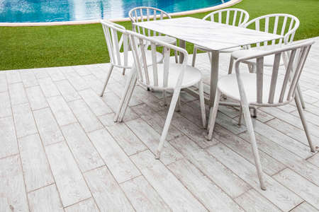 White wooden dining table by the pool inside the resort