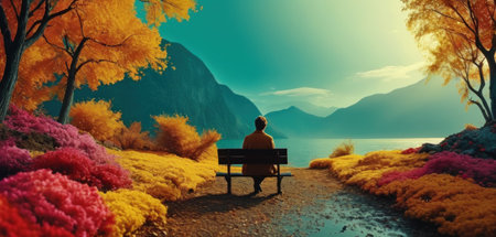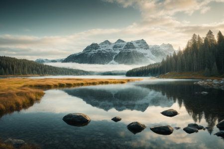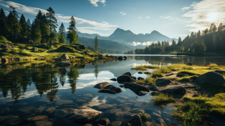 mountain peaks rise majestically amidst a tranquil atmosphere, surrounded by lush green forests and serene lakes, evoking a sense of calmness and relaxation in this breathtaking magical landscape, perfect for nature lovers and photography enthusiasts seeking soothing visuals. ai generated