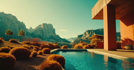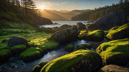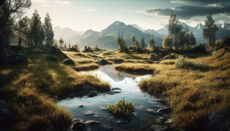 a breathtaking scenery landscape featuring majestic mountains basking in the warm glow of the sun. this photo captures the essence of a playstation 5 screenshot, with impressionist-landscapes and photo-realistic details. the 32k uhd resolution brings out the beauty of the minimalistic serenity, creating a cabincore vibe that could easily grace the pages of national geographic. ai generated
