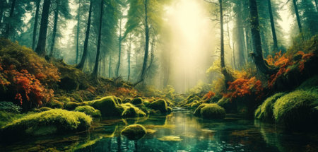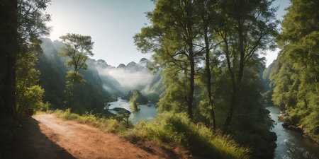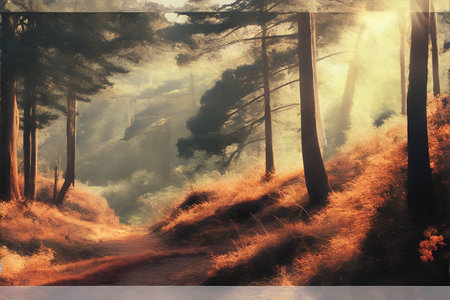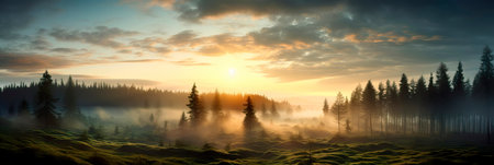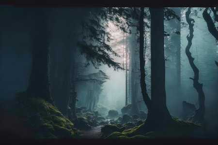 Misty Forest Morning during the early morning hours, creating a mystical and atmospheric landscape. Generative AI