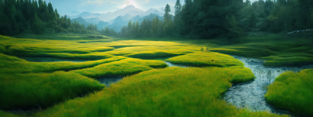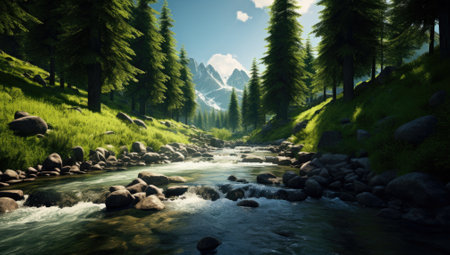 A beautiful landscape with a river and mountains in the background. The grass is green and the rocks are brown